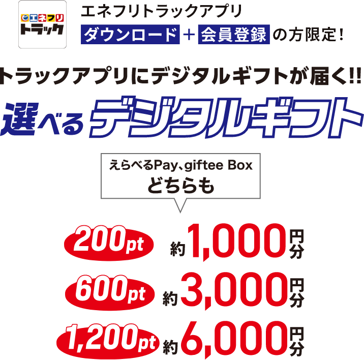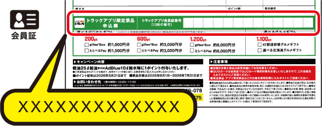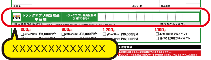 トラックアプリの「会員証番号13桁の数字」をポイント台紙の「選べるデジタルギフト申込欄」にご記入頂き、専用封筒で申し込み下さい。