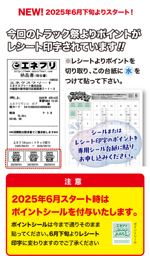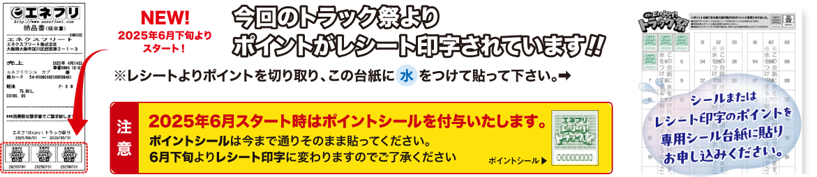 エネフリ直営店にある専用ポスターに、ポイントシールを貼っていただくか、レシート印字ポイントはスタッフにお渡しください